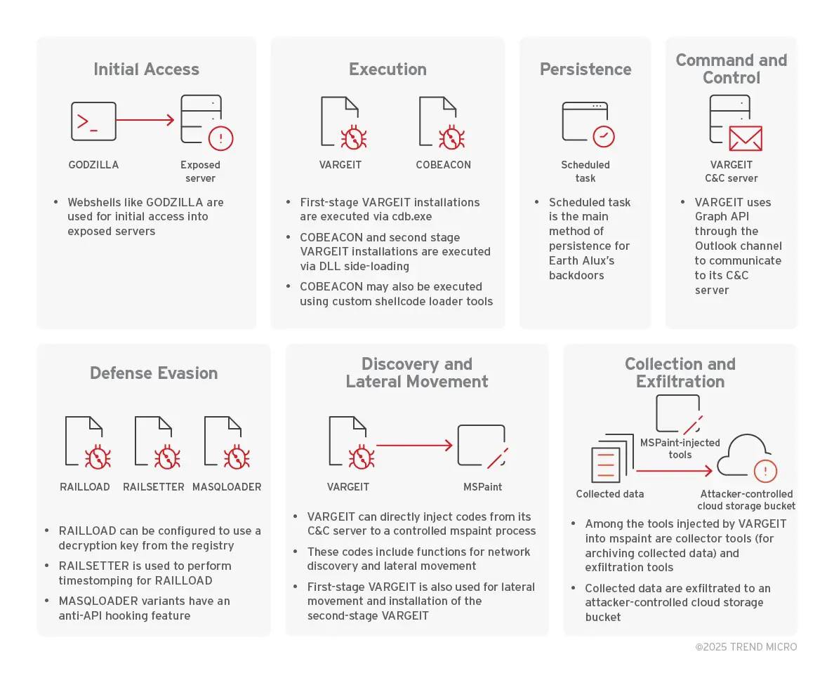 Nhóm Earth Alux, có liên hệ với Trung Quốc, đã nhắm mục tiêu vào các tổ chức trên khắp khu vực Châu Á – Thái Bình Dương và Mỹ Latinh từ năm 2023. Nhóm này tập trung vào các lĩnh vực như chính phủ, công nghệ, logistics, sản xuất, viễn thông, dịch vụ CNTT và bán lẻ.