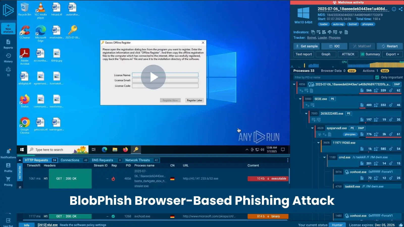BlobPhish là một chiến dịch phishing tồn tại trong bộ nhớ, hoạt động từ tháng 10/2024, khai thác Blob URL APIs của trình duyệt để đánh cắp thông tin đăng nhập từ người dùng Microsoft 365, các ngân hàng lớn và nền tảng tài chính. Đây là một mối đe dọa mạng gần như vô hình với các công cụ bảo mật truyền thống.